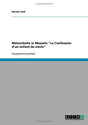 Hauptseminararbeit aus dem Jahr 2004 im Fachbereich Romanistik - Franz??sisch - Literatur, einseitig bedruckt, Note: 2,0, Humboldt-Universit??t zu Berlin (Institut f??r Romanistik), Veranstaltung: Romantisme - Romantik: Epoche / Epochenbegriff, 12 Eintragungen im Literaturverzeichnis, Sprache: Deutsch, Abstract: Die Arbeit ?€Melancholie in Mussets ?€La Confession d'un enfant du si??cle' besch??ftigt sich mit dem Thema der Melancholie und ihrer historischen Entwicklung seit der Antike. Zu den Melancholie-Symptomen, die direkt am Roman, und hier insbesondere an der Hauptperson